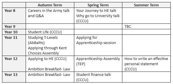 Students receive ad hoc assemblies and events throughout the year, including information on apprenticeships, higher education and from local FE colleges. All students are offered a careers guidance interview with the school’s Careers Advisor or an external Personal Advisor. In addition, students receive direct information to help them make post-16 progression decisions. Instruction and support are given to enable students to use the Kent Choices website to research and apply for post-16 courses of education. Year 11 students are able to access a range of employers and careers activities during the school's annual Careers Week in March. The careers team operate a lunchtime drop-in service in the school library every school day. Students are encouraged to use Unifrog to research and record their careers journey. |