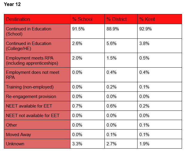 In July 2024 our Year 11 and 12 students destinations, with data provided by the Local Authority, were: