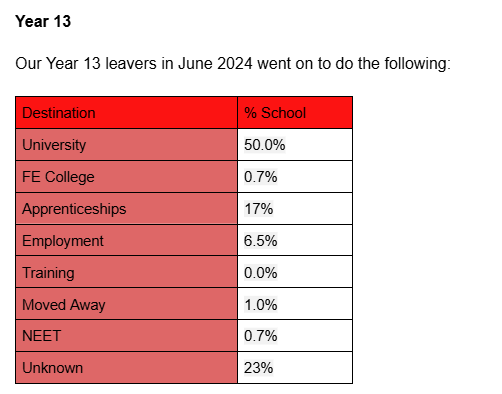 In July 2024 our Year 11 and 12 students destinations, with data provided by the Local Authority, were: