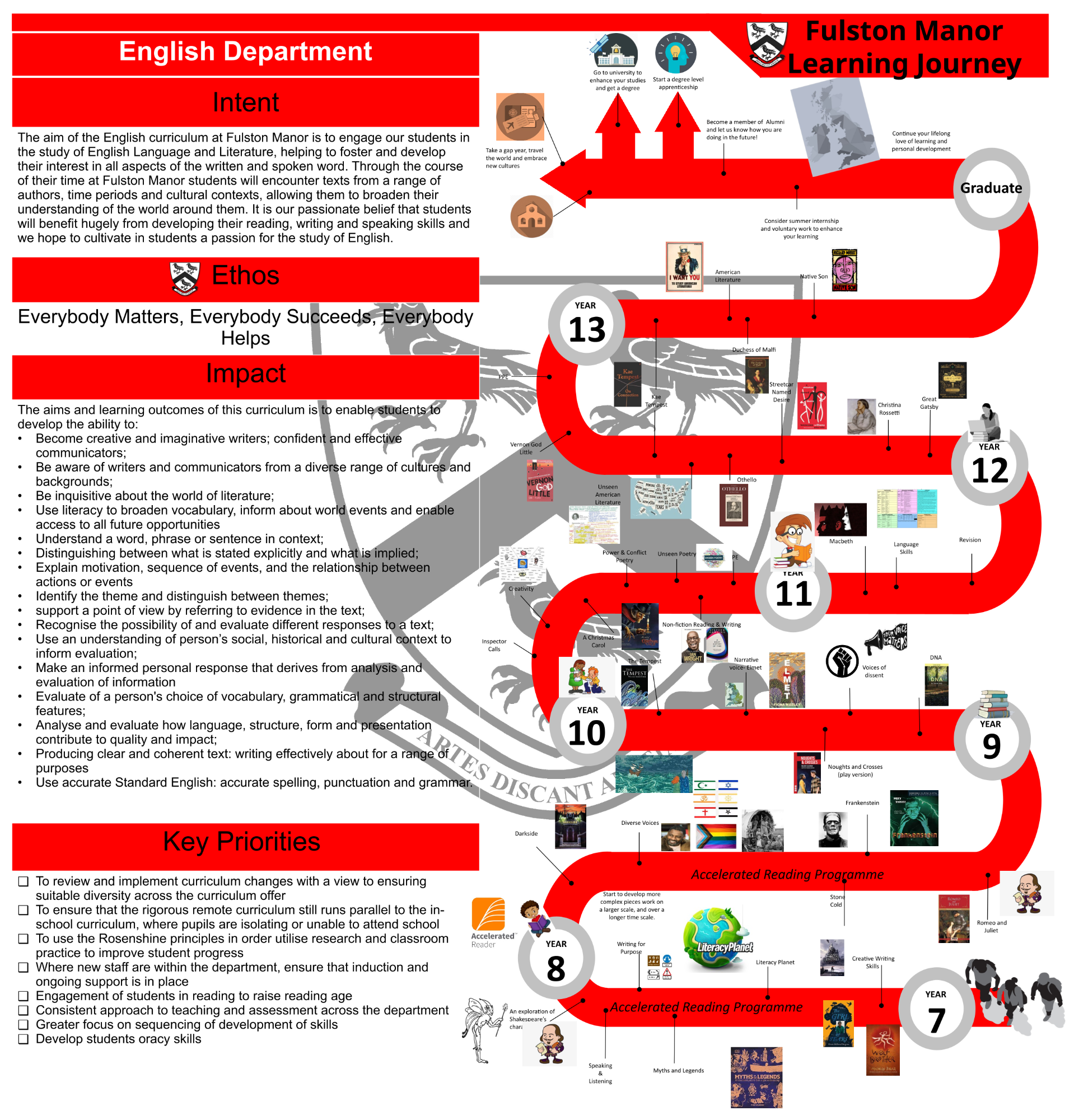 The aim of the English curriculum at Fulston Manor is to engage our students in the study of English Language and Literature, helping to foster and develop their interest in all aspects of the written and spoken word. Through the course of their time at Fulston Manor students will encounter texts from a range of authors, time periods and cultural contexts, allowing them to broaden their understanding of the world around them. It is our passionate belief that students will benefit hugely from developing their reading, writing and speaking skills and we hope to cultivate in students a passion for the study of English.