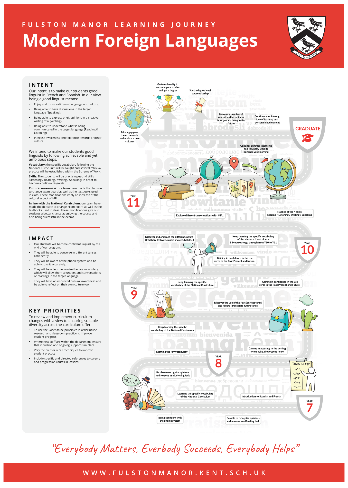 The department aims to produce confident and capable linguists who will develop the skills to communicate independently with others both by spoken and written means about a range of topics, using a range of vocabulary, tenses and complex structures. Students will be able to express thoughts, views, reasons and opinions which in turn will improve their social and thinking skills and ability to cope with the unexpected. With English being no longer the most spoken first language in the world, a foreign language is a great asset and can offer a wide range of career paths and it’s not just for use on holiday.